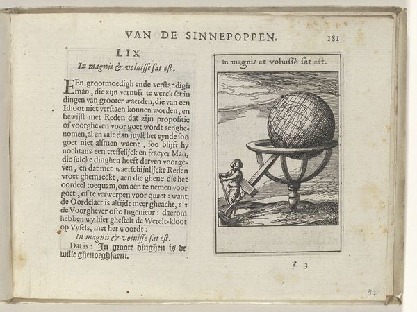 Curator: Before us, we have Roemer Visscher's engraving "XL Leert het u kinderen niet" from 1614, held here at the Rijksmuseum. It’s a fascinating example of Dutch Golden Age printmaking. Editor: The image struck me immediately as stark, almost haunting. The crab dominates the foreground, but there's a sense of… unease? Like something isn’t quite right. Curator: Visscher often embedded moralizing messages in his art. Looking closer, this image is a visual proverb – a commentary on parental influence, with the title translating to "Do not teach your children". Editor: So, the crab becomes a symbol... perhaps representing parents who themselves embody undesirable behaviors. Its sideways movement, alluded to in the text adjacent, becomes symbolic of errant behaviour and influence. Curator: Exactly. Consider the items around the crab—the playing cards, and other signifiers. These allude to gambling and vice. The overall piece serves as a critique of hypocrisy, where parents warn against behaviors they themselves partake in. Editor: This resonates strongly with the historical context. The 17th century in the Netherlands saw burgeoning mercantile success and new ideas that destabilized traditional roles and family structures, leading to societal anxieties about moral education. It challenges those in authority... the very social contract between parents and their children. Curator: And yet, isn’t the endurance of such moralising symbols remarkable? They seem to point to enduring human failings as much as specific societal shifts. Editor: The genius of the image resides in that very layering of symbolism. The crab, games of chance and dice-- these hold so much associative meaning. Visual elements carrying a weighty historical understanding over centuries, making Visscher’s critique both deeply personal and universally recognizable. Curator: Seeing Visscher's work through this lens, exploring themes of identity, parental example, societal expectation, reveals such surprising intersections. Editor: Absolutely. These early emblems invite an interrogation of our values today, reminding us how potent a singular symbol can remain.