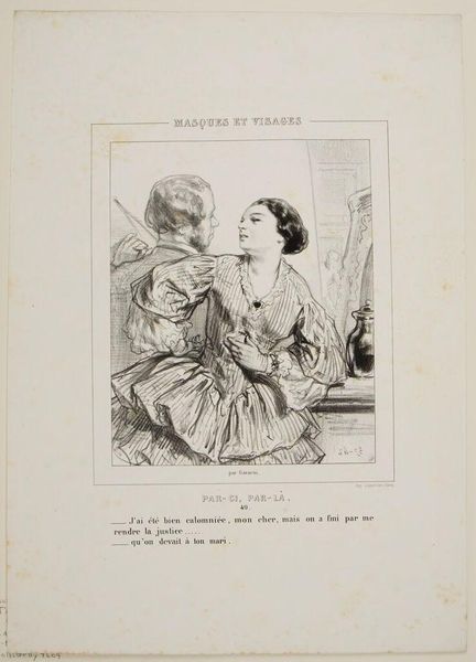 Editor: This is "The End of a Novel" by Paul Gavarni. I’m struck by how this simple sketch conveys such vulnerability. What do you see in this image? Curator: The figure's outstretched hand and the child she cradles speak to fundamental human needs: sustenance and protection. The title implicates a narrative, suggesting a character whose story has reached its tragic conclusion. Editor: So the artist is using familiar tropes of destitution to evoke emotion? Curator: Precisely. Gavarni taps into pre-existing cultural scripts. Consider how the turban worn by the figure might signify exoticism or otherness, layering further meaning onto her plight. Notice how Gavarni uses the semiotics of pose and dress to underscore the image’s message. Editor: That’s fascinating. I never thought about the turban as a symbol in this context. Curator: It is in these visual cues that we uncover how much images shape and reflect our shared understanding of the world. Thank you for letting me share this with you.