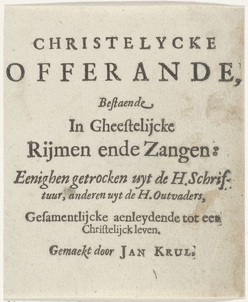 Curator: Here, we have a title print from 1694, crafted by Adriaen Schoonebeek. Its full title, translated, describes it as depicting the sea battle between Dutch and French ships in the North Sea. Editor: My first impression is that it feels like a carefully constructed declaration. All the text, symmetrically placed and intensely focused, projects authority and Dutch naval power. Curator: Precisely. This work exists as a prelude to a series of prints detailing the battle. Look at the use of language: "Nette afbeeldinge," or "neat depiction," implies a meticulous accuracy, a documentary intention despite the inevitable propagandistic elements. It clearly situates itself within a broader sociopolitical and cultural landscape. It sets the tone, framing the viewer’s perception of the events to follow. Editor: The Baroque sensibility is evident. While there is no overt imagery yet, the very presentation of text adopts the era’s taste for grandeur and display. Even fonts and their hierarchy project might! "Hollandze Oorlogschepen" for example. The symbolism inherent is Dutch power at that time. Curator: It certainly uses Baroque aesthetics to emphasize Dutch military prowess. Consider the context; this was a period of intense maritime rivalry, and imagery of naval victories played a significant role in shaping national identity and solidifying power structures. Who controlled the sea controlled the trade routes, thus the wealth of a nation. Editor: This work highlights continuity. Typographic arrangements resemble other forms of early modern heraldry, establishing pedigree, authority, and legitimacy in ways still relevant today. Visual communication borrows from an understood visual language. Curator: It calls upon both history and present politics to shape how these images are received. Editor: A perfect intersection between naval might and the rise of the printing press, one defining the other, if only visually. Curator: Yes, thinking about Schoonebeek's intent, it becomes more apparent. Thanks for that connection, as I look at the larger narratives surrounding power and image making. Editor: It was just a fascinating print that immediately brought forward a time when symbolic imagery and typographic authority ruled!