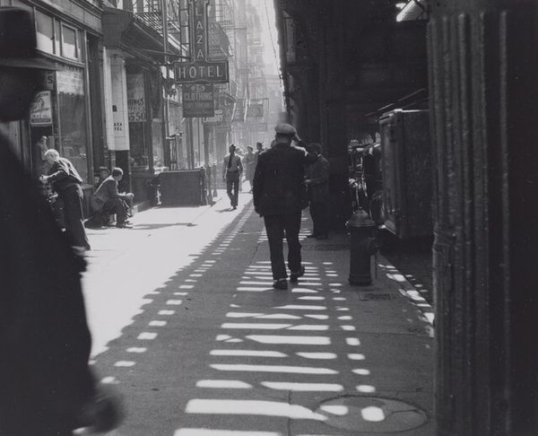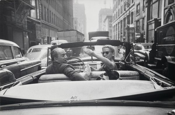 Curator: Welcome to this exhibit! We’re looking at Garry Winogrand’s "Park Avenue, New York," a photograph taken in 1959. Editor: Well, my first thought? Absurdity in black and white! A monkey in a convertible in the middle of Park Avenue – it’s the kind of image that makes you question reality. Curator: Precisely. Winogrand’s work often plays with the spontaneous and the unexpected, revealing social dynamics in mid-century America. Here, the presence of the monkey prompts questions about class, spectacle, and the human-animal divide. It evokes an intersectional reading concerning who has access to the city and on what terms. Editor: It’s wonderfully chaotic. The city looms in the background, buildings stacked upon buildings, and in the foreground, this… utterly random scene unfolds. The woman looks unfazed. The man is intensely serious and drives with a somber look in his face, meanwhile, Mr. Jocko is the most present. Maybe the photograph is asking what and who exactly is the spectacle in the urban arena, I wonder? Curator: Definitely. The woman’s detached expression can be viewed in several ways, perhaps revealing something about the privileged bubble, or as an indicator of an affect of gender roles prevalent at the time. It’s interesting that Winogrand captures a narrative here. A kind of urban theater about the absurd juxtaposition. Editor: Yes! It feels voyeuristic but inclusive. It almost makes me wonder how staged the moment could be. Regardless, it’s undeniably gripping. You want to know more about these people and their strange pet, to find an alternative backstory of a still reality. Curator: Winogrand's street photography captured many similar ambiguous social situations. It opens an interesting conversation around the construction of meaning through images, especially regarding the way photographic meaning is related to the lens of intersectionality. This black and white rendering really brings the contrast forward and accentuates the tonality of 50s photography. Editor: Looking at this again makes me think about how much our interaction with urban spaces has changed and remained the same. It kind of reflects on how different New York must've been then! This piece feels very potent. Curator: I agree, this piece stays with you and it helps us look at contemporary realities with new eyes. Thank you for your insights! Editor: Thanks for having me! It was a delight.
