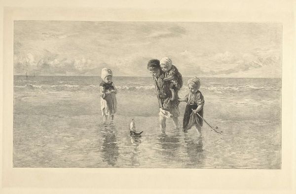 Carel Lodewijk Dake created this artwork, Vier kinderen spelen met speelgoedbootje op het strand in ondiep zeewater, as an etching. The texture of the surface is dominated by fine lines and soft shading to create a subdued, tranquil scene of four children at the beach. Dake masterfully employs the etching technique to capture the interplay of light and water, adding depth and realism. The composition draws your eye across the horizon. The children are arranged to create a sense of depth, inviting you into their quiet moment. The use of line and shading in the children's figures gives them a tangible presence, while the water's surface reflects the sky and figures above, blurring the line between reality and reflection. The quietness of the beach and the children's absorption with their simple toys presents a contrast to the industrial revolution, in which the landscape and social interactions create a haven of innocence. The artwork’s formal qualities, such as light and composition, go beyond aesthetics. The image creates a dialogue between the fleeting experience of childhood, the impact of modernity, and the nostalgic desire to return to a simpler existence.
