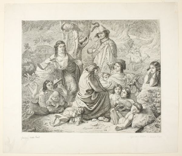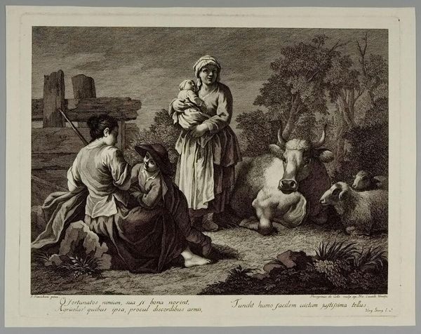 Pellegrino dal Colle created this print, "Herdersfamilie in landschap," depicting a herder family within a pastoral landscape. Born in 1737, dal Colle lived during a time of significant social and economic change, with traditional rural life increasingly idealized in art. In this work, the artist explores themes of labor and family roles. The composition presents a gendered division of labor: the woman spins wool while the man, possibly the father, rests. The children are either working or playing, and the presence of animals suggests the family's dependence on livestock for survival. The image evokes a sense of rustic simplicity, yet it's important to consider the historical context. Dal Colle’s work, and the wider pastoral genre, often romanticized rural existence, glossing over the hardships and inequalities inherent in agrarian societies. Instead, we might see how the representation of the herder family is embedded in a complex web of societal ideals, gender expectations, and the realities of labor.
