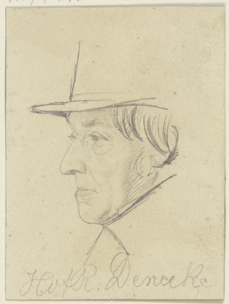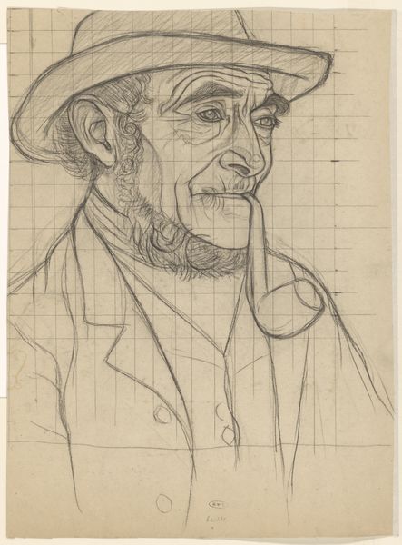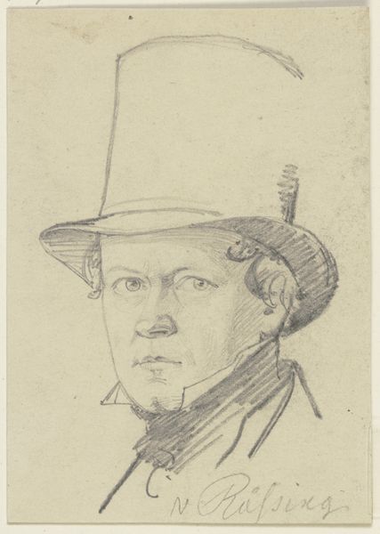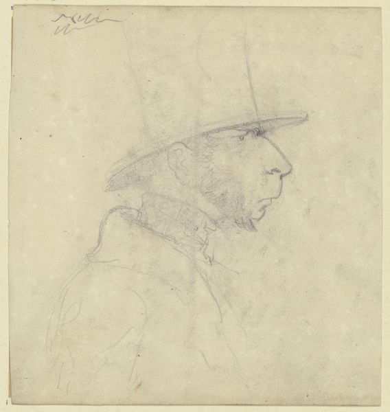 Editor: This is Jan Veth's "Prent uit archief Jan Veth," created in 1908, and housed at the Rijksmuseum. It appears to be a pencil drawing. The figure seems contemplative, almost melancholy. How do you interpret this work, focusing on its formal elements? Curator: The most striking feature is Veth's mastery of line. Observe the subtle variations in pressure, creating depth and shadow with minimal strokes. Note how the hat's texture contrasts with the smoother rendering of the face, drawing attention to the figure's interiority. Do you see a dynamic relationship between the lines describing form versus the void, defining a visual narrative? Editor: Yes, I see that now. The negative space around the figure seems just as important as the figure itself, creating a sense of isolation, perhaps? How does the artist achieve that using solely a pencil? Curator: Precisely. The use of toned paper, coupled with delicate hatching, establishes a subdued tonality. It avoids stark contrasts and creates a unified surface. Veth directs the gaze, leading it from the hat's intricate linework down to the soft shading defining the face, using chiaroscuro to sculpt form and express emotion. Look how the line directs our perception to the temporality of the moment. Do you see the artist as observer? Editor: Definitely! He captures a fleeting moment, like a candid snapshot, but rendered with incredible detail using minimal elements. It makes you wonder about the relationship between the artist and the sitter. Curator: Exactly. Veth invites the viewer to explore the nuanced relationship between line, form, and affect, transcending mere representation to communicate the subject's essence. Editor: This formal analysis really illuminates how technique informs our understanding of the emotional depth within the work. Thanks. Curator: Agreed. Examining its formal qualities allows a deeper appreciation for the artist's intentions and technical skill.