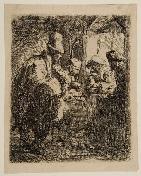 Curator: This print, "Five Peasants at a Tavern Window," is by an artist known as C. Closin. The scene shows a group of figures enjoying themselves, crammed into a window frame. Editor: It looks… unrestrained. The etching is incredibly detailed, but the mood feels festive, earthy, almost raw. Curator: Rawness is an interesting term here. Consider the context – images of peasants were often created by and for a wealthier class. The humor might rely on stereotypes, reinforcing existing social hierarchies. Editor: Yes, but look at the rendering of the faces, the clear signs of labor, etched deep into the skin. There’s an honesty in the material depiction, regardless of who commissioned it. The artist is showing their labor as well. Curator: Precisely! It’s a dialogue between the artist's labor and the subject's lived experience, filtered through societal biases, of course. We have to read it with those critical lenses. Editor: Agreed. It shows us both production and reception are equally vital to understanding art’s full meaning. Curator: Ultimately, a piece like this allows us to think critically about representation and labor in art. Editor: Definitely food for thought about the material and the metaphorical.