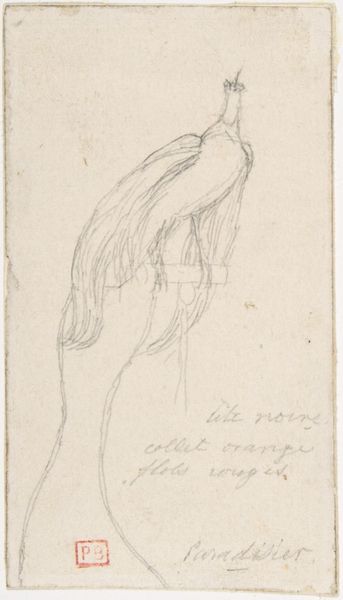 Curator: Looking at this pencil and ink drawing by Gerrit Willem Dijsselhof, titled "Ooievaar," created sometime between 1876 and 1924, one can’t help but feel a sense of spontaneity. It’s currently housed right here in the Rijksmuseum. Editor: Indeed, it exudes a sense of immediacy. The stork, captured with these sparse, somewhat whimsical lines, has an almost endearing vulnerability about it. There is some unfinished detail there too, I imagine we will get to that shortly? Curator: Precisely. The unfinished detail does invite us into Dijsselhof's process. Notice how the stark black of the ink creates dynamic weight and a graphic presence next to the feathered texture. The overall design and form are emphasized as the most fundamental part of the composition here, not realism. Editor: It is true that the very act of sketching – of quickly capturing the essence of a creature – carried particular resonance during a period of heightened interest in capturing images via the newly invented technology of photography. As an unfinished work we might be led to consider questions such as how artistic practices were navigating newly established boundaries between documentary image making, and free form artistic image-making. Curator: Yes, considering the art historical context that contrasts the growing mechanical eye and human freehand works on the perception and cultural relevance is certainly pertinent. The form's overall composition, for example, leads one's gaze smoothly across the page. There is also that interesting loose study up above as well, more akin to rudimentary geometric forms. Editor: Absolutely, but I'd like to push on the idea of process and its contextual significance. We are perhaps primed to value “finished” artworks. Works such as this, however, allows for a closer inspection of process, which may be interpreted through lenses of socio-economic history. Dijsselhof's family, for example, moved into more artistic circles. Perhaps it's a depiction of burgeoning social capital that offers another point to think about the relationship between the subject and object. Curator: You always offer the most refreshing observations. This discussion has revealed layers of insight I had not previously considered in my appreciation of the composition's form and medium, allowing us to examine the nuances of form and social value. Editor: Likewise, exploring the interplay of these basic marks alongside your breakdown reminds me that even seemingly simple works on paper often function as a fascinating touchstone in understanding an artwork's status.