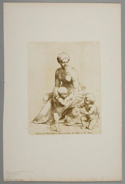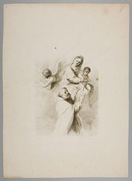 Curator: This is Alphonse Leroy’s “Madonna and Child," housed here at the Harvard Art Museums. Editor: The sepia tones give this piece a dreamlike quality, almost as if it’s emerging from memory. Curator: Indeed. Notice how Leroy subtly blends the sacred and human aspects. The tender gaze, the slight touch, all work toward an archetype of maternal love that still resonates today. Editor: But these images were also used to normalize women’s roles, confined to motherhood. This image, while beautiful, reinforces traditional expectations. Curator: Yet, it also symbolizes strength, resilience, and the divine feminine—cultural pillars for centuries. It’s a symbol of hope in dark times. Editor: I suppose analyzing the layers of meaning, both empowering and restricting, is part of truly seeing. Curator: Exactly. It makes us reconsider the weight of such imagery on the collective psyche.