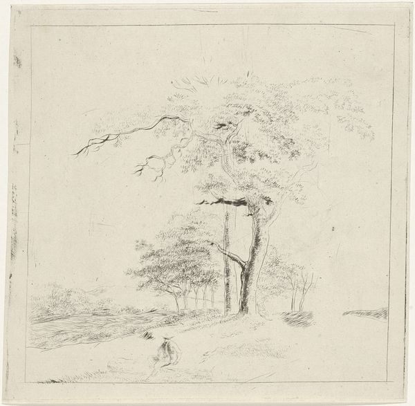 Editor: So, this drawing, “Figuurtje in een bos” by David Alphonse de Sandoz-Rollin, dates roughly between 1750 and 1809. It's a graphite drawing of a figure in a forest, a plein-air sketch perhaps. There’s a delicate, almost dreamlike quality to the scene. What's your take on this piece? Curator: It’s tempting to view this work solely through a romantic lens. However, consider the socio-political context of the late 18th century. This period was marked by intense class disparity. Does this tranquil scene reflect an escape, perhaps a carefully constructed contrast to the reality of societal upheaval experienced by most? What do you notice about the figure's placement within the landscape? Editor: Well, the figure is small, almost dwarfed by the trees. It feels like the artist is emphasizing nature's dominance. Curator: Precisely. And what does nature signify during this period of Enlightenment ideals? While some celebrated reason, others, often privileged, found solace in nature's sublimity, implicitly critiquing the burgeoning industrial world that threatened established social hierarchies, like the aristocracy of Sandoz-Rollin himself. Is there an implicit critique of societal structures encoded in this retreat to nature? Editor: I hadn't thought about it that way. It’s fascinating how a seemingly simple landscape drawing can hold so much complex commentary about class and society at that time. Curator: Exactly. It reminds us to question whose perspective is centered within these idyllic scenes and whose labor allowed for their creation. Examining art this way opens space for a broader, intersectional understanding. What do you make of the choice to create it “en plein air”? Editor: Possibly about authenticity? Curator: Indeed! It challenges artifice. Understanding these contextual layers empowers us to critically examine how we continue to represent landscape and identity today. Editor: I appreciate the additional insight that the drawing isn't necessarily a purely Romantic work, but that it offers some observations about culture, society and class. Thank you!