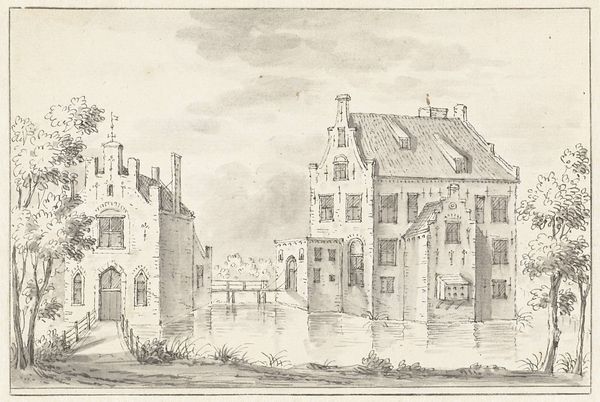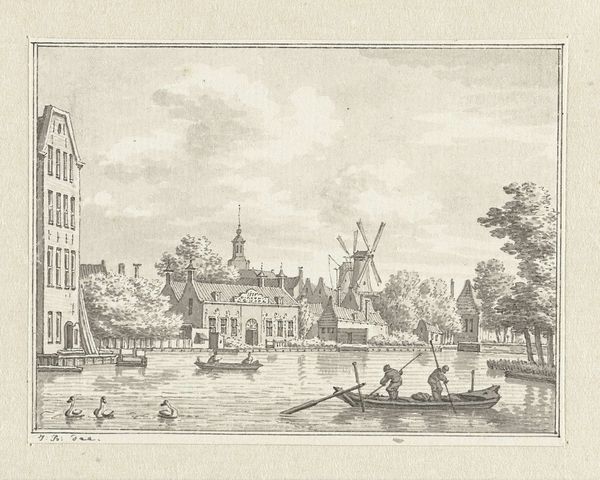 Editor: Here we have a rather lovely, if austere, engraving of the 'Gezicht op de Doelensluis en de Binnen-Amstel te Amsterdam,' dating, possibly, sometime between 1710 and 1766. It's anonymous, and depicts a cityscape in that recognizable Dutch Golden Age style. I'm immediately struck by the detail, given it's an engraving. What jumps out at you about it? Curator: It's funny you mention detail, because my initial impression is of something almost ghostly – a memory rendered in delicate lines. The water especially seems to breathe with the whispers of time, doesn't it? What do you think the artist might be trying to capture besides a simple depiction of Amsterdam? Editor: Hmm, a feeling of timelessness maybe? Like freezing a moment in history. I also find myself wondering about the choice of viewpoint – why *this* particular angle? Curator: Exactly! This vantage point gives us a sense of being just outside the bustle, almost like an observer. You can almost hear the city going about its business just beyond the frame. It makes me think about how cities are constantly changing, but also, paradoxically, how some things remain the same. The essence, perhaps? What's your take? Editor: I hadn’t considered it like that. Now I am thinking of old maps where they use particular angles for specific stories, sort of making-real an imaginative concept... it seems now this print has done similar. Curator: It does! It is a history painting but also history *making*, too. Seeing this work now really reinforces for me how art can freeze a feeling just as much as a scene. What a beautiful dialogue the print and our conversation make! Editor: I agree! It really makes me appreciate the narrative possibilities within what seemed at first a straightforward architectural study.