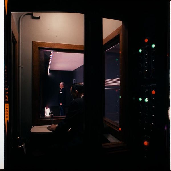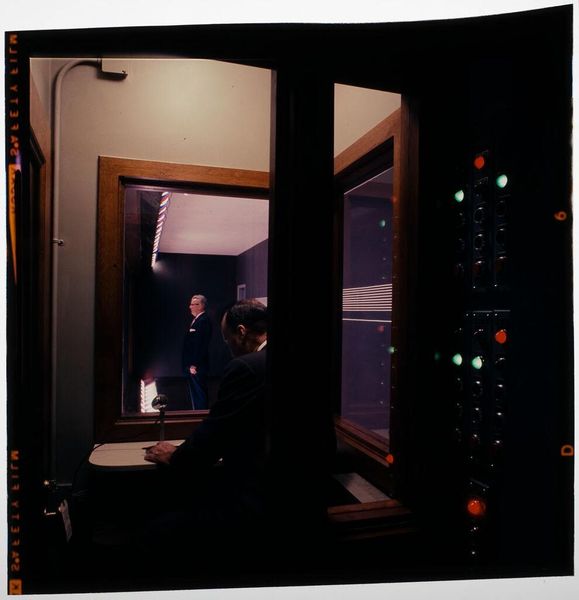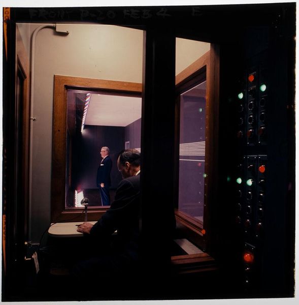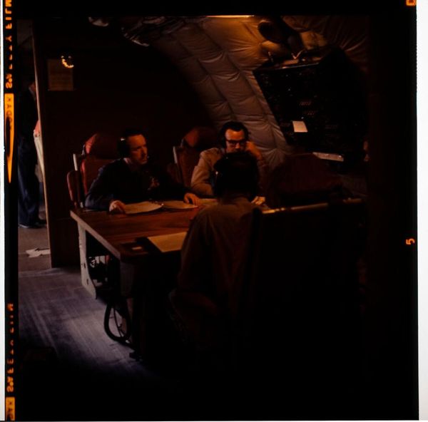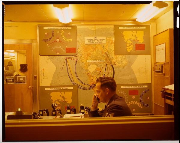 Curator: This unassuming little photograph, simply titled "Untitled (men on military telephones)," is by Jack Gould and is part of the Harvard Art Museums collection. It's a mere 6x6 centimeters. Editor: That size is perfect, almost like a hidden peepshow. All that dim, institutional lighting and those massive, vintage phones give a feeling of weighty secrets. Curator: The image evokes the Cold War era, reflecting anxieties about communication systems and military bureaucracy. It asks us to consider the individuals behind these systems and their role in larger geopolitical events. Editor: You know, there’s something poetic about the human voice traveling through all those wires, all that machinery. It’s like a tangible link to some larger, unseen network. Like fate, almost. Curator: Indeed, and the photograph itself participates in this network, reminding us of the constant circulation of images and information, and how these contribute to our understanding of history. Editor: Exactly! Makes you wonder what those men were talking about. Life or death? Love or duty? We'll never know.