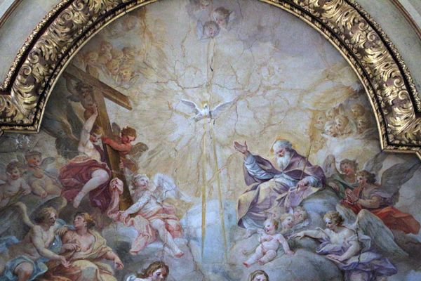 Editor: This is Placido Costanzi's "The Immaculate Conception" from 1730, and it looks like oil paint, maybe even a fresco. It’s so ethereal! All those figures floating on clouds... it makes me wonder about the sheer labor involved in producing something like this, especially at that scale. What can you tell me about it? Curator: It's compelling to consider the fresco tradition within a materialist framework. How does the quick-drying nature of fresco, its reliance on specific plaster recipes and pigment interactions, shape the iconography itself? Look closely; the vibrant blues are costly. Editor: So the materials themselves could influence the subject matter? Curator: Absolutely. Think about ultramarine, derived from lapis lazuli. Its expense dictated its usage – often reserved for the Virgin's robes. The availability and cost of materials impact the visual language and the very stories being told. Who would have had access to create works like this, and who was the intended consumer of this idealized image? Editor: That makes a lot of sense. The people funding this type of work must have been incredibly wealthy to afford these resources and skills, right? And that would, of course, inform its overall meaning. Curator: Precisely. And think about the physical labor involved in preparing the walls, mixing pigments, and applying the paint, often by numerous assistants. These workshops and their economics also defined artistic production in this period. Editor: This perspective gives me so much to consider. Thank you for connecting materiality with such powerful images, It's so useful. Curator: Understanding the material conditions of artistic production reveals so much about the historical, social, and economic forces at play. A different way to read familiar images.