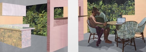 Iwo Zaniewski's painting 'Designer' presents a study in contrasts and spatial relationships, achieved through a muted palette and careful composition. The viewer's eye is drawn across the herringbone floor towards a figure in the background, framed by a doorway. The painting is structured by its geometry and relative perspectives; the brown hues that dominate the walls and floor create a sense of enclosure, subtly juxtaposed with a modern black stripe on a white canvas, a detail which punctuates the scene with a hint of the avant-garde. This element introduces a play between the interior world and artistic creation. The work invites us to consider how the domestic and the abstract intersect. The seemingly mundane setting gains complexity through the interplay of its visual elements. Zaniewski's arrangement doesn't offer clear resolutions, instead, it prompts ongoing visual and intellectual questioning.