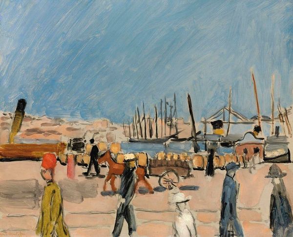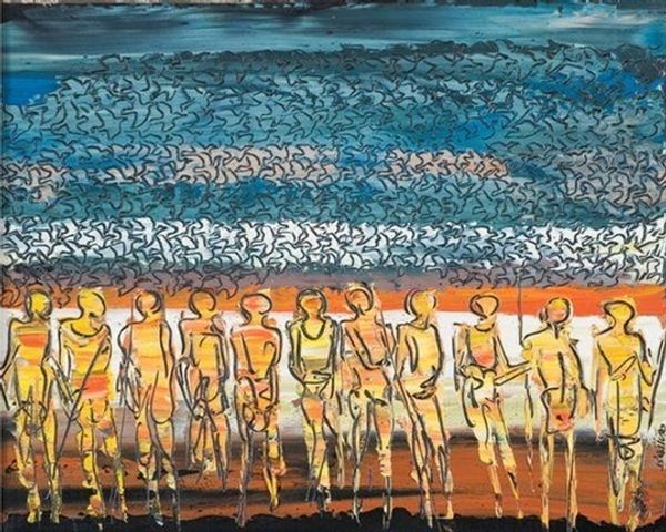 Editor: Here we have "A Gathering," an acrylic painting by Walter Battiss. The brushstrokes are so visible, and the figures seem to almost melt into the landscape. It feels both serene and strangely dynamic. What strikes you about the visual structure of this painting? Curator: The dynamic energy is, indeed, generated from the interplay between the flatness of the picture plane and the suggestion of depth. Note how Battiss uses color—predominantly blues and yellows—not to describe reality, but to construct a compositional rhythm. The brushstrokes themselves function as formal elements. How do these formal relationships affect the painting as a whole? Editor: I see what you mean. It's like the subject matter is secondary to the way the colors and lines are interacting. So the rhythm, that’s key? It sort of makes the figures part of the abstract forms. Curator: Precisely. Consider the interplay of light and shadow – they serve less to illuminate the scene than to create visual interest and direct the eye across the surface. Do you notice how the artist has suppressed details in the representation of human forms, turning the persons into shapes or blocks? Editor: Yes! It is less about who is present and more about the activity. I almost missed that because I got caught up in the figures being part of that same structure you mentioned before. This painting gives a lot more weight to structure, color, brushstrokes, and shape, making you wonder if this is more abstract expression than a regular landscape piece. Curator: Agreed. By focusing on these formal aspects, the artwork offers a meditation on painting itself. The act of depiction transcends representational limitations. Editor: Well, this look into its formality and shapes over telling who and where allowed a broader perspective. I appreciate that explanation!