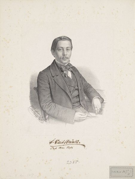 Dirk Jurriaan Sluyter made this portrait of Hendrik Tollens using lithography, a printmaking process that democratized image production in the 19th century. Lithography relies on the chemical repulsion between oil and water. The artist draws an image with a greasy crayon on a flat stone, treats the stone with chemicals, and then wets it. When oily ink is applied, it sticks only to the crayon marks. The image can then be printed onto paper. Unlike engraving, which requires laborious cutting, lithography allowed for a more direct, expressive mark. Here, we see that freedom in the delicate rendering of Tollens's features and clothing. The process enabled mass production of images, making portraits like this accessible to a wider audience, and shaping the visual culture of the era. Considering lithography's role in disseminating images, we can appreciate how this portrait contributed to the construction of Tollens's public persona, blurring the lines between art, commerce, and the rise of celebrity culture.