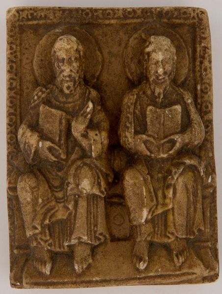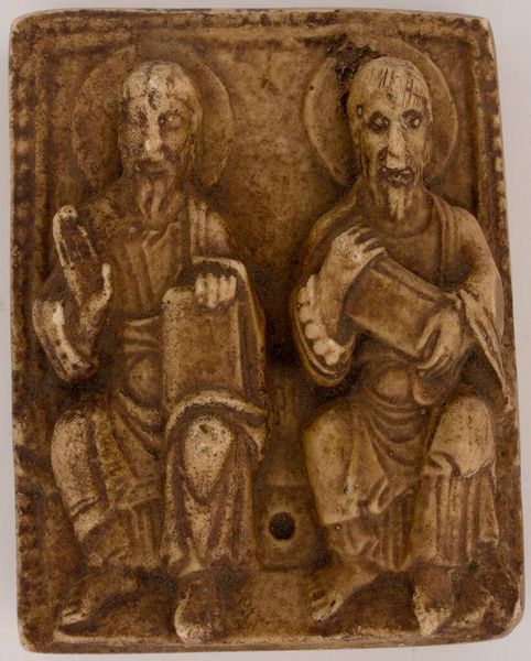 Curator: Here we have a small, intimate carving entitled "Pair of Apostles," by an unidentified maker, housed here at the Harvard Art Museums. Editor: There's a remarkable sense of solemnity conveyed in such a compact form. The figures are static, yet their shared space seems charged with a quiet intensity. Curator: Indeed. The figures, likely meant to represent apostles or evangelists, each hold a book, a symbol of their teachings and the divine word they carry. The halos, though simple, suggest a spiritual authority. Editor: Given its scale, I wonder about its original purpose. Was it part of a larger altarpiece, a personal devotional object, or even a teaching tool? The tactile quality of the material suggests it was meant to be held, contemplated. Curator: Quite possibly. This size makes the image transportable, an intimate object of faith carried from place to place, reinforcing the message of salvation. Editor: Its survival speaks volumes about the care taken in its creation and preservation, a testament to the enduring power of belief rendered in a humble medium. Curator: It serves as a window into a worldview where the spiritual and the material were inextricably linked. Editor: An interesting object, indeed, offering us a glimpse into lives shaped by faith and the skilled hands that gave it form.