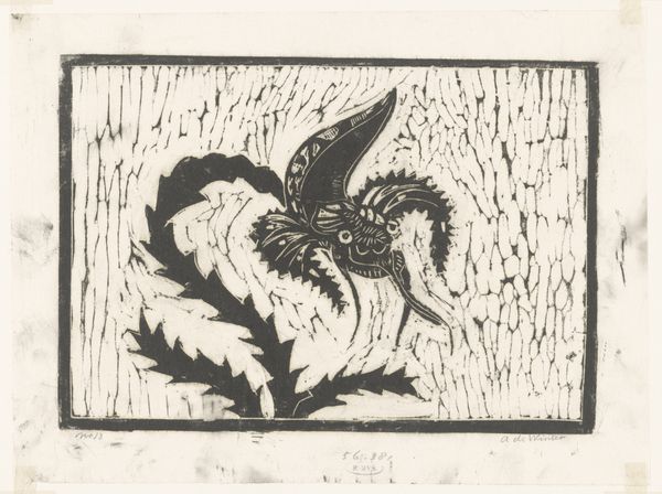 Editor: We’re looking at Janus de Winter’s "Butterfly on a Flower," a print made sometime between 1892 and 1951. The stark contrast and delicate lines of the woodcut give it a peaceful yet somewhat melancholic feel. What do you see in this piece? Curator: The piece strikes me as an intriguing study in contrasts, specifically the interplay between the organic forms and the rigid geometry. Note the thick, dark border that frames the scene. How does that containment affect your reading of the butterfly and the bloom? Editor: It does feel very contained, almost like a specimen under glass. I hadn't thought about that. Curator: Precisely. Observe how the artist uses the graphic language of woodcut to render textures. Consider the coarse grain of the paper, which fights against the smoothness one might expect in depictions of delicate flora and fauna. Does the textural dissonance evoke anything for you? Editor: It's interesting... it adds a rawness, an honesty to it. Like it’s not trying to be overly pretty. It focuses you on form, and composition over say… emotion? Curator: I agree. Now, regarding the symbolic import, we can examine the butterfly, long considered an emblem of metamorphosis and transience, juxtaposed with the stationary flower. De Winter sets up a silent discourse through their interaction. Notice that tension created, this is a symbolic structure—life cycles encapsulated. Do you find this compelling? Editor: Definitely! It makes you think about bigger themes using simple shapes and composition. Curator: Precisely, and by interrogating the relations and structures on the image plane itself, we bypass personal associations and find a larger narrative encoded in the work's formal elements. A satisfying close reading, I think. Editor: Absolutely. Looking at art this way really focuses you on the power of simple composition.