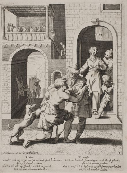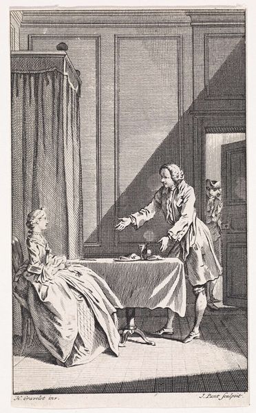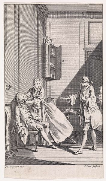 Curator: Immediately, I get a feeling of a theatrical performance frozen mid-act, wouldn’t you agree? All eyes are turned towards the guy stepping into the scene, radiating anticipation—or perhaps anxiety. Editor: Well, let’s set the stage properly. What you're observing is an etching and pen illustration by Jan Punt, dating back to 1749, held at the Rijksmuseum. The title is “Alwaardij ontvangt Blisil,” which, directly translated, means "Alwaardij Receives Blisil". It certainly encapsulates the essence of genre painting. Curator: Genre painting! Of course, domestic scenes were such fertile ground in those times for witty observations about human behavior, and the power dynamics within households. Is it fair to say there's a bit of social commentary simmering beneath the surface here? I am mostly impressed by the masterful rendering of light and shadow in this pen illustration. How did Punt make use of simple pen strokes to bring to life such different characters and capture their personality? Editor: I believe Punt's illustration prompts us to look deeper into the construction of gender roles within 18th-century society, perhaps using clothing to define those who "belong" versus the intruder "Blisil". Notice how the composition stages Blisil as almost caught off guard by Alwaardij’s apparent affluence, evidenced by the furniture, the decorations. One can even sense a clash between a new bourgeois sensibility and an older, more entrenched one. Curator: Absolutely. Though at first, it felt rather innocent, a lighthearted scene— but seeing the interaction described as gender roles performative or something in competition, it adds a delightful depth! I wonder about Alwaardij, lounging so nonchalantly; there’s power in stillness, isn’t there? Almost cat-like. And that mischievous little figure perched atop the cupboard in the back? Tell me that isn’t deliberate. Editor: Indeed. The layering within this baroque scene—the social, material, and visual layering—creates this commentary on visibility. Who is permitted to enter? What performativity is expected, and what power dynamics dictate those performances? Ultimately, Punt prompts a re-evaluation of these dynamics that remain relevant today. Curator: Yes. Perhaps Jan Punt just wanted to present a snapshot of his time, with both playful and thoughtful considerations… In doing so, and I must say that he has made a striking testament to the nuances of daily life. Editor: Absolutely. From social power relations, the play of light and shadow and human connection. Jan Punt offers endless conversation, then and now.