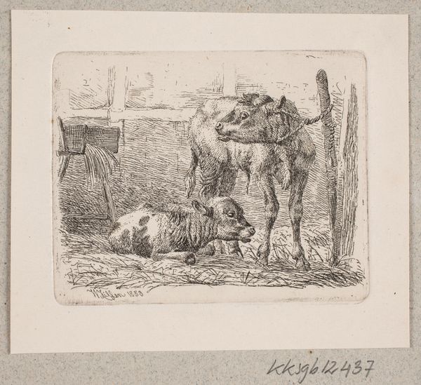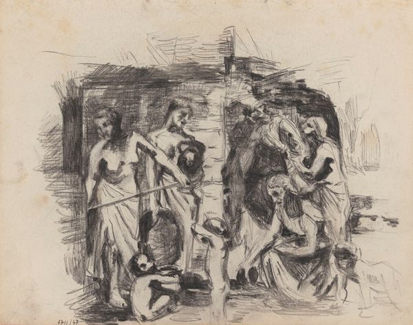 Editor: So, this is *Interior with Four Drinking Men*, a drawing from somewhere between 1825 and 1863 by Guillaume Joseph Vertommen, housed here at the Rijksmuseum. It’s made with etching, ink, and pencil, giving it this loose, sketched feel. I’m struck by how… informal it feels. What’s your read? Curator: It's intriguing to consider this work through the lens of production and social context. Notice the emphasis on line and form, achieved through etching and ink, suggesting it may have been created as a preparatory sketch or print intended for wider distribution, potentially cheap. Editor: Interesting! So, it might have been made for mass consumption, almost like a proto-cartoon? Curator: Precisely. How do you think this impacts our interpretation of the work versus a painting on commission from a wealthy patron? It may well speak to ideas of labor, access, and class. Vertommen presents an every-man theme, don't you think? Drinking wasn’t only a gentleman's’ pursuit. It involves ordinary individuals as well. Editor: I never thought of it like that! The material aspects really shift how we see the figures themselves, turning them from unique portraits to representations of broader social behaviors accessible to others through material production. The artist, therefore, acted like a social mirror. Curator: Exactly. It challenges this traditional high-art narrative by acknowledging craft and reproduction and the lives of working-class or middle-class subjects, not just the elite. I feel we gain insight on cultural norms. Editor: It's fascinating to consider how the work's production informed its subject and audience. I had not realised there was so much cultural analysis that could spring from materiality. Curator: The choice of material is a lens through which to understand labor, access, and even subversion within art historical narratives.
