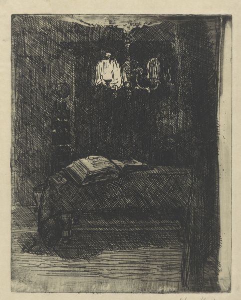 Gerard Jan Bos created this etching, "Study of an Interior with Stove," sometime between 1875 and 1943, capturing a quiet domestic scene. Bos, born in the Netherlands, lived through a period of industrial and social change, and his intimate interior scenes reflect a focus on daily life. The humble setting invites us to consider the realities of class and labor. What does the presence of a stove, simple tools and a clog tell us about labor, domesticity, and the lives of working-class people during this era? How is our perception of ‘home’ shaped by the unseen labor required to maintain it? Bos's choice of a commonplace subject elevates the ordinary, prompting us to find beauty and value in the everyday. In a time of rapid change, Bos seems to find solace in the simple, enduring aspects of human experience. This etching reminds us to consider the stories embedded in our own surroundings, and to value the often-unseen labor that shapes our daily lives.