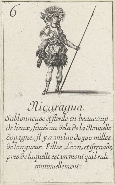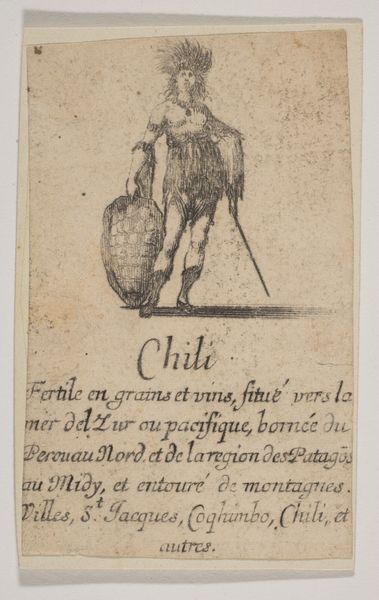 Editor: So this is "Numidie, from 'Jeu de la Géographie'," by Stefano della Bella, from 1644. It’s an etching, a rather small print actually. It looks like a playing card, and this central figure is just… strange. How do you interpret this work? Curator: Immediately, I'm drawn to the symbolic weight this single figure carries. It’s not just a portrait; it represents a whole region, Numidia, through visual shorthand. Notice how the figure’s clothing – that skirt of reeds, perhaps? – evoke a specific place and climate. How does that detail strike you? Editor: It gives me a sense of a person *from* the land, as if they’re literally made of it. Curator: Exactly. Bella uses this allegorical figure, draped in symbols and associated with written description below, to convey a potent image of a far-off, exotic place. But it’s more than just an image, isn't it? Think about the text alongside the illustration. Does that framing shape your view? Editor: It does. Mentioning "beautiful black marbles" links the image to trade and resources. It hints at a specific vision filtered through a European lens. Curator: Precisely. What stories, what stereotypes, is Bella reinforcing, and perhaps, even subtly questioning through this combination of imagery and text? The power of iconography lies not just in what is shown, but also in what is left unsaid. Editor: I see what you mean. There's a lot more going on here than I first thought. Thanks for sharing that! Curator: My pleasure! Every image is a tapestry woven with threads of history, culture, and personal perspective, waiting to be explored.