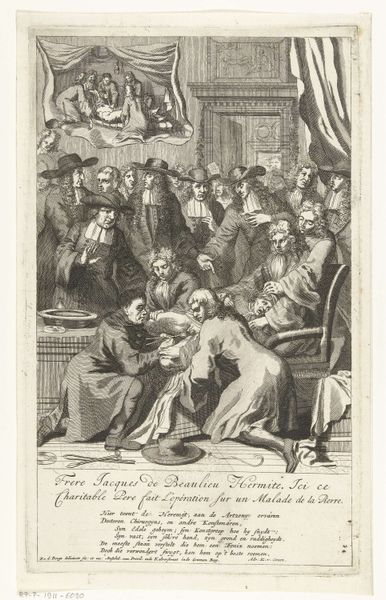 This print, titled 'De hostie wordt aan de zieke toegediend, 2,' was made by an anonymous artist. The image has been realised through a method known as ‘engraving’, where lines are cut into a metal plate. This then holds ink, and is printed onto paper. Look closely, and you’ll see that this technique has a direct influence on the aesthetic of the print. The cross-hatched lines create tonal variation, and the precision of the cuts gives a distinct graphic quality. As a method, engraving sits firmly at the intersection of craft and industry, demanding both artistic skill and technical expertise. The social context is very interesting. It captures a religious scene in a time of change, with varying lines of text in different languages, reflecting the broader debates of the time. The print’s relatively small size also speaks to its function as a portable, reproducible image. The artwork invites us to consider the blend of artistry, labor, and belief inherent in its making.
