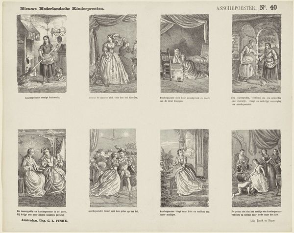 This print titled "Verschillende voorstellingen" by W.J. Kat presents us with a series of vignettes, each a window into domestic life and folklore. Consider the depiction of the swan, a motif that transcends cultures and eras. In classical mythology, the swan is associated with purity and grace, often linked to tales of transformation and divine intervention. Yet, here, it appears in a more earthly setting, perhaps alluding to folk tales where animals possess human-like qualities, serving as guides or omens. This echoes in the image of a woman, perhaps a mother figure, carrying a heavy basket. The weight she bears is not just physical; it is a symbolic load of domestic responsibilities. Observe how these images evoke a sense of nostalgia, triggering deep-seated memories and emotions. Such symbolism taps into our collective unconscious, resonating with primal instincts and archetypal narratives.