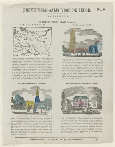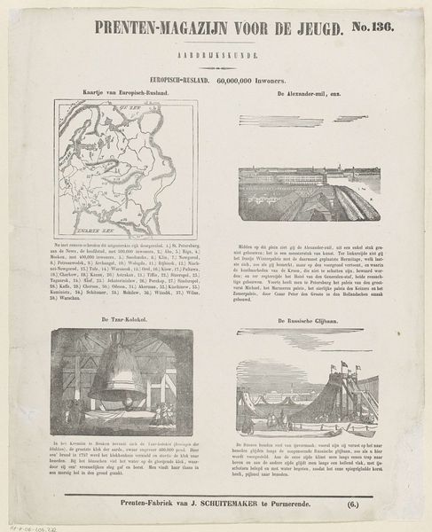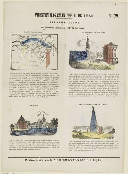 Editor: Here we have “De provincie Zeeland,” a print by Willem Bal, created sometime between 1850 and 1881. It appears to be a collection of different scenes in the province. Given the varied imagery and almost textbook-like presentation, I’m wondering what its purpose might have been. How do you interpret this work in terms of its social context? Curator: This image strikes me as a fascinating piece of visual propaganda and perhaps even historical revisionism packaged for juvenile consumption. Consider its placement within a “Prenten-Magazijn voor de Jeugd”—literally, a picture magazine for youth. What lessons about Zeeland are being imparted through these carefully chosen scenes? Editor: Lessons? You think it's pushing a particular agenda? Curator: Absolutely. Note the scenes: a detailed map perhaps instilling regional pride or awareness, a dramatic shipwreck narrative reinforcing Zeeland’s maritime identity and its struggles against the sea. There's even a church ablaze! All contribute to a constructed narrative of Zeeland's history and character, one aimed at shaping the values and beliefs of young readers, through a blend of geography, tragedy, and even civic pride displayed by the statue of Jacob Cats. Who controls the narrative, controls the present. What do you think, do these isolated events make for cohesive, if not somewhat forced, Zeeland identity? Editor: It's eye-opening how these images, seemingly innocent, are carefully selected to construct a specific idea of Zeeland for young audiences. I never considered how even something like a children’s magazine could play a role in shaping public perception of history and regional identity. Curator: Precisely. By examining the magazine’s images we gain understanding of historical manipulation tactics, a stark reminder to approach seemingly innocuous cultural artefacts critically.