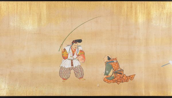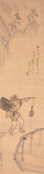 Curator: Alright, let's gather around this intriguing piece, a watercolor illustration called "Zhang Guolao and His Magic Mule." It’s unsigned but hails from China, sometime between 1368 and 1911, during the Ming or Qing Dynasty. Editor: The muted palette gives it a dreamlike, ancient feel, like looking at a fading memory. There's a lightness to it, even though the figure seems quite weighted down by his…mule-situation. Curator: It's deceptive, isn’t it? Zhang Guolao was one of the Eight Immortals in the Taoist pantheon. That 'mule' is part of his iconography. See how lightly rendered the line work is, the watercolor almost bleeding into the toned paper? Editor: Almost a watercolour "underpainting" feeling, very immediate...And this mule, I have to admit, looks more like a somewhat agitated beetle than a sturdy beast of burden. What does the 'magic mule' typically represent? Curator: The mule actually folds up like a paper donkey when not in use! Zhang Guolao would carry it around in his pocket, only to bring it back to life by sprinkling water on it. Symbolically, the mule signifies the adept’s ability to transcend the mundane world and embrace transformation. Also, to reverse things when needed, to go backward if one has to… Editor: That image of a folding mule really captures a specific Eastern notion of condensed energy and latent potential, like a seed holding a massive tree within! I feel like the incomplete sketch and watercolor bleed hint at a life and a story barely held in shape. Curator: The ‘incomplete sketch’ aesthetic might also reflect a philosophical idea: nothing is ever really complete, existence itself is in flux. Look how loosely the old man and mule are placed on the paper. Is there another meaning in this mule’s beetle-like shape and tiny dimensions? Editor: Maybe it's not just about outward form. Maybe it’s that even the smallest thing, seemingly insignificant – a bug, perhaps – can carry a divine presence, like an immortal man and a magic mule…or vice versa. Curator: A beautiful insight. The beauty of this quick artwork by Yin Qi lies in its layered simplicity, revealing deeper spiritual connections with prolonged looking. Editor: Yes! Something seemingly slight unveils echoes of vast philosophical currents, flowing beneath the immediate moment.