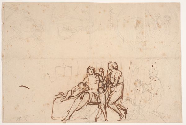 Agostino Masucci sketched Studies of an Apostle Guided by an Angel and the Adoration of the Shepherds using pen and brown ink with brush and brown wash on laid paper. Masucci, born in Rome, lived in an era steeped in the traditions of the Catholic Church, which heavily influenced artistic expression. The sketches offer insight into the religious and cultural climate of 18th-century Italy. The composition explores themes central to Christian theology, like divine guidance. Notice how Masucci renders the figures. The apostle is portrayed with a sense of humility and devotion, while the angel embodies purity. What might these representations tell us about the prevailing societal expectations of faith, obedience, and gender roles during that time? These sketches, studies for larger, grander paintings, show the labor it takes to create. Masucci’s work invites us to consider not only the religious narratives being portrayed but also the social and artistic practices that shaped their creation.