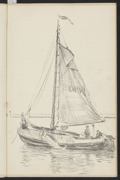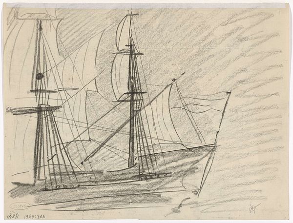 Editor: Here we have Carel Adolph Lion Cachet's "Zeilboten op open water" – that's "Sailboats on Open Water" – created around 1890. It's a drawing using charcoal and colored pencil, currently residing at the Rijksmuseum. The heavy charcoal creates an atmosphere of a storm brewing on the open water. How do you see this work? Curator: The stark contrast created by the charcoal interests me. Look at how it defines the sailboats, setting them against what appears to be tumultuous water, yet are these pencil marks simply a way of representing the energy involved in seafaring? Does the choice of charcoal, a relatively inexpensive material, speak to the accessibility of maritime leisure to a growing middle class in the late 19th century? How was this work commissioned, who was its target audience, and how was it priced and marketed compared to painting? Editor: That's an interesting way of thinking about it. I hadn't considered the socioeconomic aspect of the materials themselves. It seems intuitive that painting would be seen as for a different level of client, perhaps. Curator: Exactly! Charcoal offered artists, and consequently, consumers, a different entry point. It hints at a democratisation of art, reflecting changes in material availability and consumption patterns within Dutch society during this period of industrial growth. Editor: So, this artwork isn’t just about boats on water. It’s about material availability, economic shifts and even changing social structures. That's fascinating. Thanks for opening my eyes to that. Curator: And for prompting me to think more closely about the socio-economic implications of these particular marks, and the modes of making.