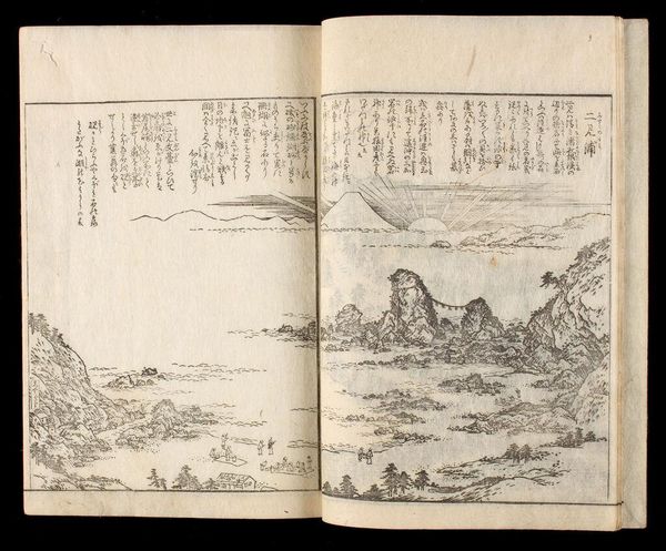 Curator: Right, well, here we have *Landscapes of Taiping Prefecture* created by Xiao Yuncong between 1640 and 1660. It's an ink and woodcut print on paper, currently residing here at the Met. My initial reaction is that it feels a little like looking at a memoryscape—distorted yet evocative. Editor: Yes, a compressed recollection…Almost claustrophobic, despite depicting vast landscapes. The repetitive curves, the jagged mountain peaks—they create this dense, overwhelming texture. Is there a symbolic function for nature to be captured this way? Curator: Undoubtedly! Mountains in Chinese art often represent stability, longevity, even immortality. The flowing water is the flux of time, and the little architectural forms suggest human striving within this immense cosmic order. It’s like Xiao Yuncong is capturing the enduring essence of a place, beyond its transient appearances, but through memory. Editor: Fascinating. So these aren't just pictures; they're ideograms almost. The cultural weight! Does the act of using woodcut have significance in creating multiples of the landscapes? Curator: Good observation. Mass production allowed him to spread these cultural memories. Think of it, replicating Taiping's image far beyond its geographical borders and temporal realities. He's not just making art, but shaping a shared identity in a tumultuous period! There's definitely longing to keep hold of a particular way of life. Editor: Precisely, maybe like the preservation of a heritage during immense uncertainty, like those old folk stories meant to keep us tethered. He freezes the landscape as an eternal reminder! But in truth, memory isn't like this… is it? Curator: No, never complete and never a perfect snapshot. But sometimes we hold tightest to the places most emotionally important, not photographically accurate to the experience but intensely important. As an iconographer, does this visual reduction of complexity hold any resonance? Editor: Indeed! Each line, each carefully carved element is infused with symbolic potency, turning landscape into legend, a shared emotional landscape accessible to many. We could get lost exploring the personal or historical circumstances, in truth the symbolism resonates powerfully even today! It has the quality of both record and dream. Curator: Well, now I will wander the gallery wondering which locations persist with the strongest clarity, the power of shared visions and lived-in moments in this hall of marvels!