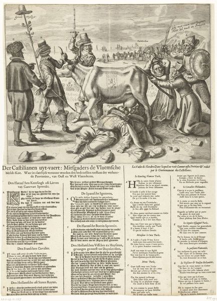 Curator: Isn’t it intriguing how images can encapsulate entire political landscapes? Consider this engraving by Crispijn de Passe II from 1656, aptly titled "The Game of War (Allegory on the Nordic War)." Editor: Woah, there’s so much going on here! My first impression is how…stark it is. It’s not a pretty war scene, it feels quite calculated, cold even. All those little figures going about their business against a backdrop of conflict—it really distances the viewer. It feels…managerial, I guess, or about strategy more than anything else. Curator: Exactly. The piece is a baroque commentary, not just on war but on the commodification of conflict. What looks like a dice game dominates the foreground, with people seemingly gambling over the spoils. Those are all the while sheep milling about, perhaps symbolizing the innocent bystanders caught in the crossfire? Editor: Definitely. It feels like a damning statement, laying bare the greed inherent in warfare. And seeing how deliberately people gamble with sacks and sacks of coin just ahead of farm animals gives it a sort of cynical undertone. Are they pawns, riches or just commodities in the game of power? How much value is truly lost by war? And how do these concepts overlap? Curator: Precisely! The inscription, with titles like "Aurea Libertas," Golden Liberty is ironic. De Passe implies that the pursuit of liberty is intertwined with the harsh realities of war. Those men counting their loot, in the foreground – are they truly free? And that backdrop with troops marching, ships firing, buildings crumbling adds weight to this bleak paradox, Editor: Absolutely, the way the artist contrasts the alleged glory of war with its human cost. You know, the way this era so meticulously engraved scenes always leaves me wondering—what was their real intended audience? Curator: Wealthy patrons and political figures likely. This would be a symbolic and, to some degree, a propaganda piece circulated amongst those directly involved. Editor: Makes you wonder about the echo chamber this engraving might have been part of, reinforcing existing power structures rather than questioning them, right? War distilled as a cold calculation; almost a grim precursor to modern military strategy. Curator: Food for thought indeed. Seeing it through that lens highlights how long these power dynamics have been perpetuated, which brings so much history to this image. Editor: For me too. So next time I encounter an overly polished representation of historical conflict, I'll remember the strategic distancing of Crispijn de Passe, forcing a re-evaluation of my own perceptions.
