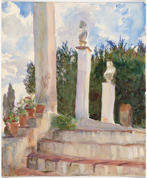 Curator: This watercolor piece by John Singer Sargent, circa 1907, titled "Loggia, Villa Giulia, Rome," immediately strikes me as an interplay of shadow and light. The cool violet sky meeting the warm tones of the architecture. Editor: It feels unfinished somehow, though perhaps intentionally. I wonder about the colonial gaze embedded within this image of Italian architecture painted by an American artist at the start of the 20th century. Curator: The impressionistic brushstrokes speak to a fleeting moment, an observation. He isn’t so much representing the loggia as he is capturing an essence, a feeling conjured by the specific conditions of light at this specific site. We can explore how the architectural form has been adapted from Classical Greek ideals through a Roman iteration to this Renaissance articulation. Editor: Indeed. And isn't it always a loaded act, this depiction of ruins, especially from a position of power? How do we consider what this choice signifies? The watercolor captures decay, an almost melancholy meditation on faded grandeur viewed through a specific lens. Curator: Watercolors are such telling signifiers; traditionally associated with a portable, ‘feminine’ amateur art practice, they speak to a certain freedom, and here the architectural subject seems softened. The precision of form associated with architecture dissolves into the impressionistic sweep of his brush. We’re allowed an intimate experience that shifts this symbol of Roman Imperial power into something softer and more personal. Editor: It's tempting to read this through a contemporary lens, thinking about how these classical structures become romanticized, almost abstracted from their socio-political origins through processes of cultural memory. It feels important to actively address this romanticizing impulse. Curator: Exactly, by doing so, we come closer to the emotional core of Sargent’s creation, which reflects a complex play between historical context and his individual emotional experience. Editor: Considering Sargent’s place in history and this choice of medium lets me begin to reassess and understand not only how we read images of ruins, but what meaning this vista had in its own time.
