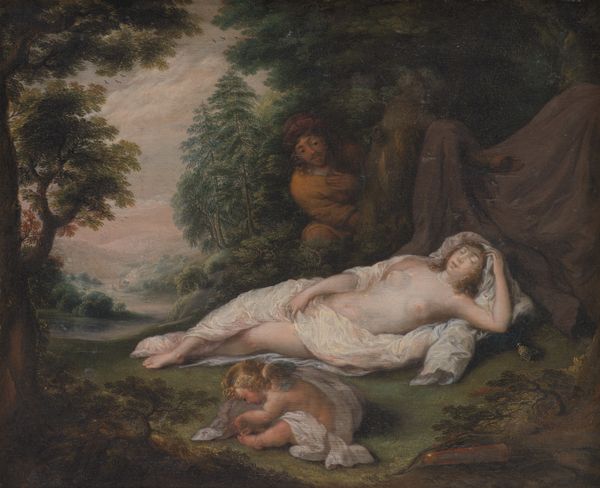 Editor: So, this is Watteau's "Diana at Her Bath," painted in 1716, using oil. I’m struck by how vulnerable Diana seems, not like the powerful huntress I imagined. What do you see in this piece? Curator: I see a potent commentary on the objectification of women, even goddesses, within art historical traditions. Consider the Rococo period. While celebrated for its aesthetic beauty, it also upheld a patriarchal gaze that often reduced women to objects of visual consumption. The painting’s sensuality can’t be divorced from that context. How do you feel Watteau is playing with traditional mythological depictions of female power? Editor: I hadn’t really thought about the male gaze, to be honest. I guess I saw it more as a simple scene. The trees are a little sad, in my opinion. Curator: Indeed. But, the vulnerability you initially sensed in Diana also challenges classical ideals. Watteau, while working within artistic conventions, hints at a subtle critique of those power structures. Do you see any elements within the composition that might subvert the dominant narrative? Consider the positioning and posture of the figures or the environment in which the figure appears. Editor: I guess the messy clothing and intimate nature, being at her bath, makes it a very unidealized setting to place the ‘perfect goddess’. That doesn't necessarily go hand-in-hand with 'huntress'. Curator: Precisely! And by placing Diana in this seemingly unguarded state, Watteau invites us to reconsider our assumptions about female power and agency within mythological art. What do we, as viewers, bring to the interpretation? Editor: That's true! Looking at it that way really makes me appreciate how Watteau used existing themes, but still offered subtle challenges to perceptions. Thanks! Curator: Absolutely! It shows that even seemingly classical artworks are entangled in dialogues of gender and representation, ripe for reinterpretation even today.