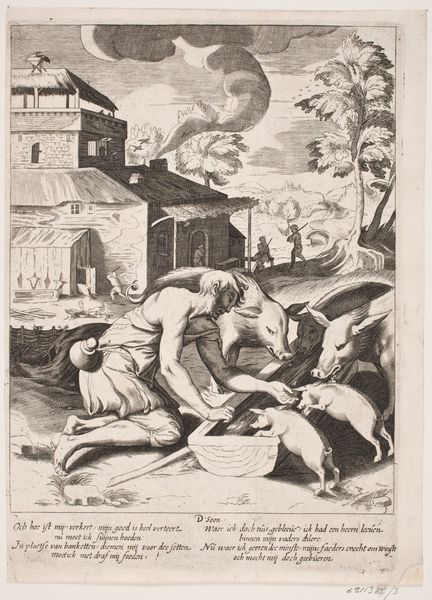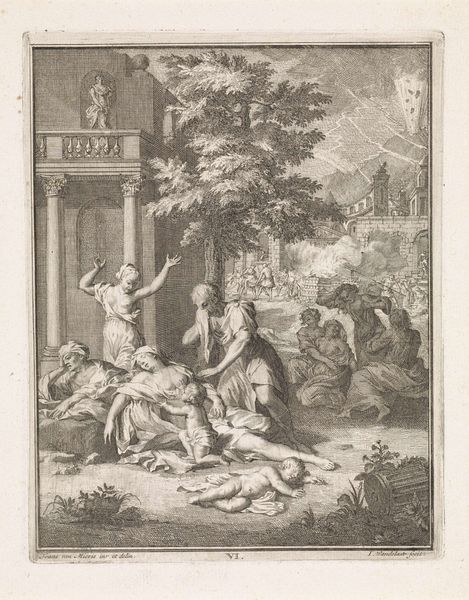 This is a monochromatic print of "Dream of Mercury with Unicorn and Peace," made by an anonymous artist. At first glance, the composition's balance, despite its complex iconography, draws the eye across the image. Note how the artist employs classical motifs: Mercury, with his winged helmet and caduceus, reclines, seemingly dreaming, while Peace, draped in flowing garments, extends an olive branch. Beside them, a unicorn—a symbol of purity and grace. Yet, this harmony is disrupted by the dynamic tension created through the juxtaposition of war and peace, chaos and order. The figure on the left, armed with a spear, and the distant naval battle hint at conflict, while the lightning overhead suggests divine turbulence. The artist creates meaning by destabilizing established symbols. Is it an idealized vision of harmony or an acknowledgement of the fragile balance between opposing forces? The formal structure of the artwork mirrors this dichotomy. It invites us to interpret and reinterpret its meaning, challenging any fixed narrative.