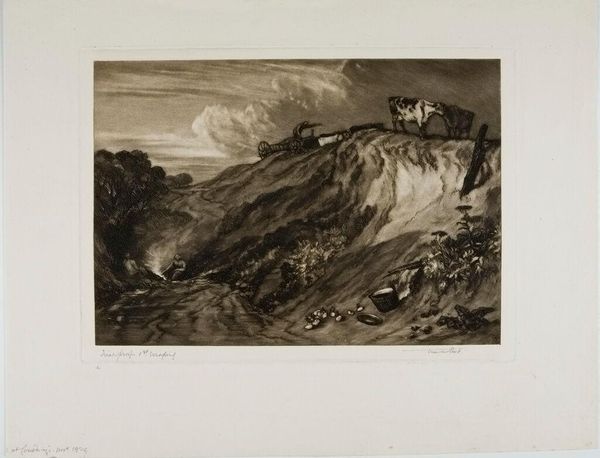 Curator: Frank Short's "Crowhurst, Sussex" presents a seemingly tranquil landscape. There's something almost melancholic about it. Editor: The sepia tones and the starkness of the etched lines definitely evoke a sense of somber reflection, which aligns with the Victorian preoccupation with mortality and the sublime. Curator: Short was deeply engaged with the etching revival movement. His technical skill is evident in the manipulation of light and shadow using aquatint and mezzotint techniques to create tonal range. Editor: And if we look at the choice of subject, it's not just an innocent landscape. The clearing of the land might symbolize the exploitation of natural resources in the 19th century. Curator: Indeed, the print becomes a document of industrial impact. The labor and the materials speak to broader economic and social shifts. Editor: It certainly provides a lens through which we can examine the cultural anxieties of the time. Curator: Thinking about the materiality and the labor… Short’s vision provides a fascinating look at a changing world. Editor: An evocative piece that encourages a deeper look.