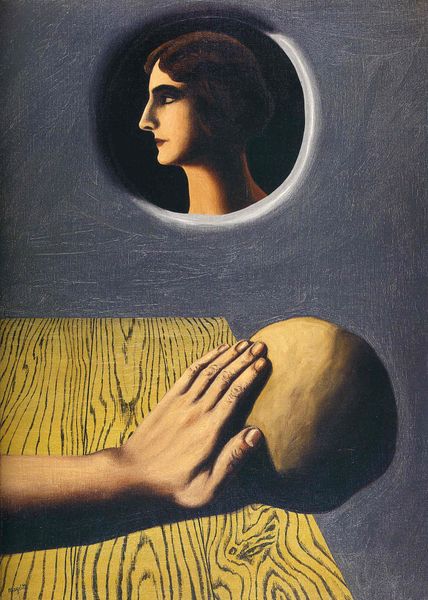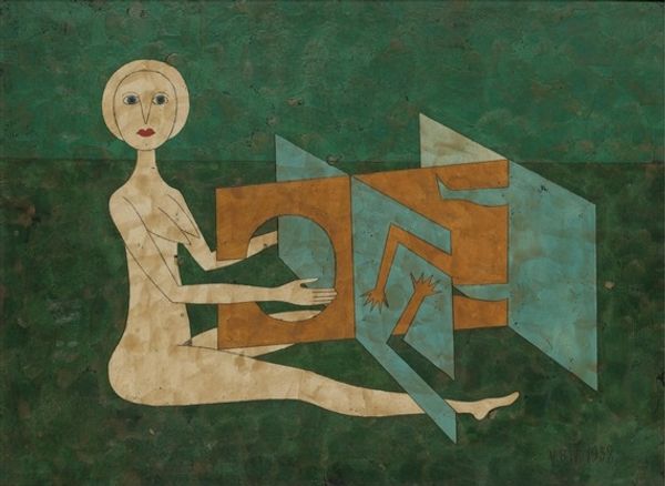 Editor: This is "Jane keeping an apple," a 1938 oil painting by André Derain. It has this quiet, almost unsettling stillness to it. I'm struck by the contrast between the stark figure and the softer still life elements. What stands out to you as you examine the composition? Curator: Immediately, the pronounced geometric structure of the painting seizes my attention. The figure, illuminated against the stark background, serves as a central vertical axis, anchoring the composition. Notice how the sharp angles of the face contrast with the curved forms of the fruit. The tabletop introduces horizontal lines which further subdivide the picture plane. What effect do you think these stark juxtapositions of geometric form have on the viewer? Editor: I guess it creates tension? It keeps me looking, trying to find a resolution. The color seems really restricted too, like the limited palette adds to the mood. Curator: Precisely. Observe the artist’s deliberate limitation of color, focusing on muted tones. This creates a harmonious unity while also drawing attention to subtle variations in texture and light. Notice, for example, the treatment of light upon the flesh of the figure, rendered with subtle gradations to emphasize its sculptural form, against the more textured background. Editor: It’s interesting how you focus on form. It makes me see things I didn’t notice before, the painting almost becomes a study in geometric relationships. Curator: Indeed, analyzing its visual elements is crucial. One uncovers the painting’s deeper structural meanings that resonate with our own intellectual and sensory frameworks. This offers more than a mere surface reading. Editor: That makes perfect sense. I can now see a lot more of what the artist was doing. Thank you for sharing your observations. Curator: The pleasure was all mine. May the analysis of such forms continue to stimulate novel interpretations!