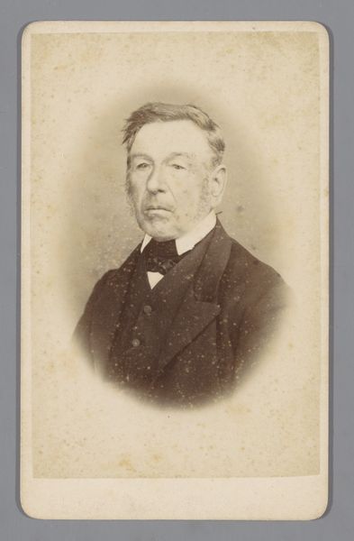 Curator: Let's consider this photographic portrait, "Portret van een onbekende man," created sometime between 1885 and 1906 by W.G. Kuijer & Zonen. It is such a classic example of photographic portraiture. Editor: There's an austerity here, isn't there? A real somber mood that the black and white intensifies. His gaze is direct, but the soft focus almost creates a barrier. Curator: The sitter's class position seems evident from the attire: the dark suit, the carefully knotted bow tie, conveying a certain bourgeois respectability that resonates with the conventions of genre painting of the time. The realists had such an affect on how people saw themselves. Editor: I find his expression so compelling. His eyes seem to carry a weight of untold stories and experiences. There's an intriguing contrast between the softness of his facial features and the firm set of his mouth, perhaps suggesting a hidden determination beneath the surface. The photographer captured something essential. Curator: Perhaps that perceived determination reflects broader shifts in societal expectations. Think about the emerging middle class asserting themselves, demanding visibility. A portrait like this could be seen as a visual manifestation of their desire for recognition. It certainly signifies success. Editor: Symbolically, his position as an unknown man also interests me. He becomes an archetype of his time and social standing; representing all those individuals forging new paths and leaving indelible marks on history, whose stories are lost. This image holds so much history and visual language within a still, quiet composition. Curator: Yes, situating this "unknown man" in his historical context enriches our understanding. We might not know his name or story but the values that underpin the composition reveal more than initially meets the eye. Editor: Agreed, delving into the symbology reveals so much! The longer I contemplate his presence, the more he evokes reflections about the collective narratives that influence personal experiences.