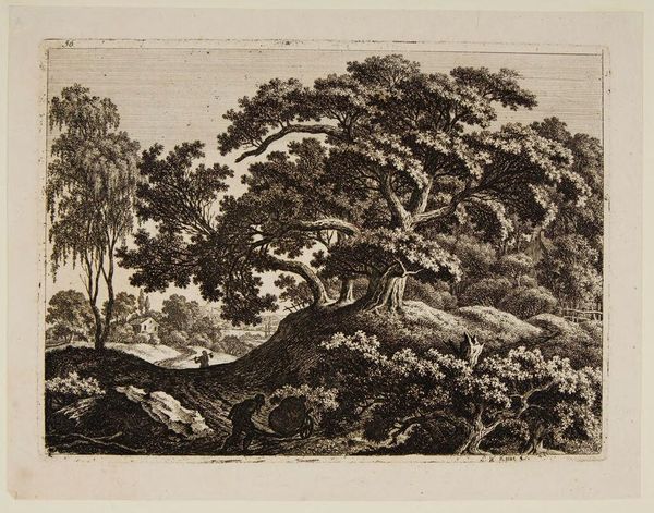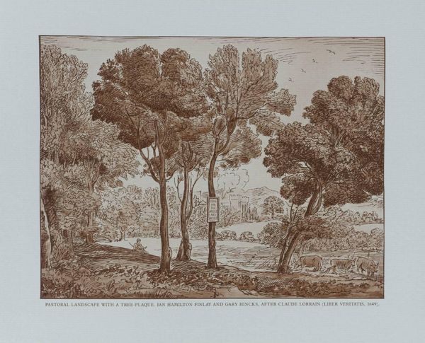Editor: This is Ian Hamilton Finlay's "Landscape with a Double Tree-Column Base," created with Gary Hincks, and it's after Claude Lorrain. The scene feels classical, but with a strange monument. What do you see in this piece? Curator: The 'double tree-column' is a fascinating image. It combines nature and architecture to evoke classical ideals and perhaps question our relationship with the landscape. Consider the symbolic weight of columns: power, civilization, permanence. Do those symbols sit comfortably here? Editor: I see what you mean. It seems like a fusion, or maybe a tension, between the natural and the man-made. It definitely gives me something to consider. Curator: Indeed, these layers of meaning reveal how artists play with our ingrained understanding of symbols. This invites a deeper reflection on cultural memory and the power of visual language.