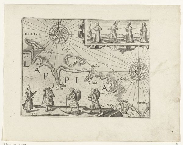Editor: We're looking at "De schepen in de baai van Valparaíso, 1615," an etching and engraving attributed to an anonymous artist, dating sometime between 1617 and 1646. It depicts ships in a bay, a scene framed within a sort of… curved cartographic boundary. I'm immediately struck by the unusual composition. What catches your eye? Curator: The most compelling element is precisely that framing device, the way the entire scene is contained. Observe how the artist uses that strong, arcing line to separate the familiar, the known world – suggested by the figures in the foreground – from the foreign, the representational space of the bay itself. It sets up a dynamic interplay between observer and observed, a dialectic, if you will, between reality and representation. Editor: So you're saying it's less about the scene itself and more about how the artist is presenting it? Curator: Indeed. The details within the bay—the ships, the land—are rendered with a degree of specificity, yet they exist within this highly artificial framework. Note how the composition leads your eye. It creates a very particular viewing experience. The use of line and the tonal contrasts are all deliberately deployed to focus your attention. Editor: I see what you mean about how the curved lines bring your eye toward the bay, where the ships and town are. How does the inclusion of what appears to be a compass rose contribute to the understanding of space within the engraving? Curator: The compass rose reinforces the print's cartographic function. What does it suggest to you, by its placement in the scene, its visual relationship to the ships and to the coastline? Editor: It suggests an element of navigation, a controlled mastery of space and travel over water. It's a strategic scene, not only artistic. I never thought I could spend so much time analyzing what at first seemed like a plain city scene. Curator: Precisely, the value lies not in the depiction itself, but rather in understanding the way in which it's depicted, how form informs meaning.