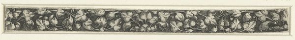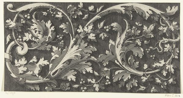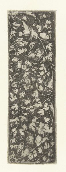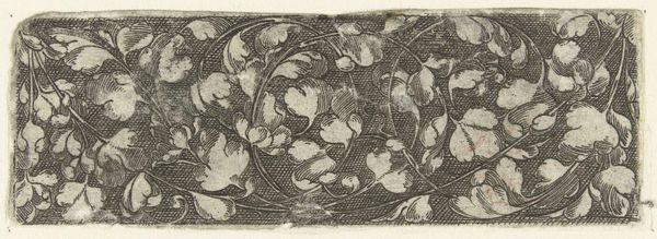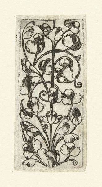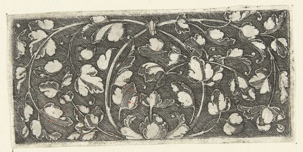 Curator: Let’s turn our attention to a lovely example of Northern Renaissance decorative arts, a pen drawing and engraving attributed to an anonymous artist active between 1500 and 1600. Its title is "Bladranken die in het midden ontspruiten uit een liggende bloem" or, translated, "Foliage springing from a reclining flower". Editor: The detail is impressive for such a small image, isn’t it? It feels delicate, almost like lace. There is a density, though; a dark ground from which the floral patterns emerge. I find that juxtaposition really compelling. Curator: Absolutely. Consider how this piece functions within its historical context. The late medieval and early Renaissance periods witnessed an explosion in printmaking. Patterns such as these weren’t just aesthetic exercises; they were tools. Editor: Tools? How so? I would have thought that botanical art, for instance, was simply concerned with the beauty of form and color. Curator: Partially, of course. However, this engraving likely served a crucial role in the dissemination of design ideas. Artisans across various disciplines, from metalwork to embroidery, relied on these printed images for inspiration. Imagine this motif gracing the border of a tapestry, the spine of a book, or inlaid into furniture. Editor: So it's about pattern books then? And that grounded dark is in fact negative space awaiting form? The flowers look very familiar. Maybe they have been incorporated into the visual lexicon of heraldry as well. Is it about the way such depictions evoke very strong associations with nobility? Curator: Possibly! These images were commodities with their own circulation patterns, shaped by the era’s social structures and craft guilds. By repeating it, they elevated these common representations and connected them with status. Editor: That idea gives me such a satisfying sense of historical depth. When I see botanical imagery rendered with this level of care and thoughtfulness, I immediately associate it with nature's cycle of death and rebirth and a sense of resilience of something living that continues beyond life. Curator: And that is likely because, in heraldry or elsewhere, this depiction continues through generations of a specific line or family. Very interesting indeed! I hope our listeners will observe even more intriguing narratives woven into this floral design.