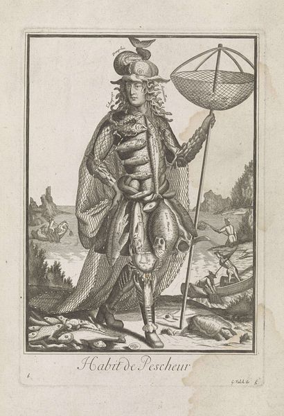 This print, titled "Oberstløjtnanten," presents a full-length portrait of a lieutenant colonel, rendered with meticulous detail by an anonymous artist. The composition strikes a balance between the figure’s dominant presence and the detailed landscape backdrop. The lieutenant colonel stands confidently, holding a spear, his elaborate attire marked by alternating light and dark stripes. The intricate patterns of his clothing, together with the ruffled collar, create a dense visual texture that contrasts with the smoother surfaces of his face and hands. The lines defining the landscape, populated with diminutive soldiers, add depth and perspective, framing the central figure. Here, the artist engages with codes of status and representation. Through the formal arrangement and detailed execution, the print not only captures the likeness of a military figure but also reflects on the broader themes of identity, authority, and social hierarchy, inviting us to consider the intricate relationship between representation and power. Note that there is no singular meaning behind the work but is an invitation to engage with evolving historical and cultural narratives.