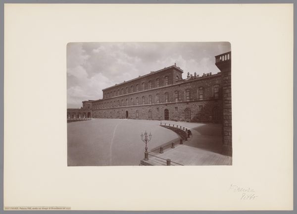 Editor: This albumen print, dating from the latter half of the 19th century, showcases the Palazzo Pitti in Florence as captured by Fratelli Alinari. There's a stillness and formality to the scene, and I'm struck by how the light emphasizes the sheer scale of the architecture. What can you tell me about it? Curator: What stands out to me is how this photograph, produced by the Alinari brothers, contributes to the construction of a particular image of Italian Renaissance power and heritage. The Palazzo Pitti, originally the residence of a powerful Florentine family, speaks volumes about social stratification and the display of wealth. Do you notice anything about the perspective? Editor: I do see that the vantage point gives us a sense of grandeur, like we are meant to feel small in comparison. Curator: Precisely. Consider how this image circulated—likely reaching audiences fascinated by European aristocracy. The photograph participates in the ongoing narrative of Italian cultural superiority, potentially overshadowing the complex labor and social dynamics that supported such architectural achievements. Editor: So it’s not just a picture of a pretty building, it’s part of a bigger story about power? Curator: Exactly! It invites us to question whose perspectives are privileged and whose are marginalized within the frame. We can use contemporary lenses to decode those complexities. For instance, considering who had the resources to commission and enjoy these spaces compared to those who constructed them. Editor: That's fascinating. I never considered the political implications of a simple photograph before. I'll definitely view such images differently going forward. Curator: I am happy that this has broadened your perception. This interplay between aesthetics, power, and representation is where art history gets really interesting.