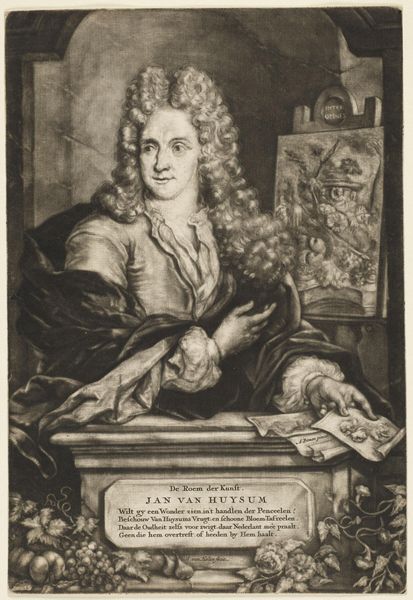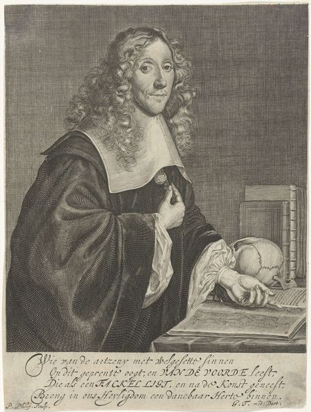 Harmen de Mayer made this portrait of Cornelis van de Voorde, likely in the late 17th century, using engraving techniques. Look closely, and you’ll see how de Mayer meticulously rendered the details of van de Voorde’s face, hair, and clothing with precise lines etched into a metal plate. The varying depths and densities of these lines create a range of tonal values, giving the portrait depth and realism. The engraver's skill is evident in the textures he suggests – the smooth paper, the fabric of the sitter’s robe, even the bone of the skull. Engraving was a highly skilled and laborious process, requiring years of training. The resulting prints were often reproduced, allowing images and ideas to circulate widely in a pre-photographic age. This portrait thus speaks to the cultural value placed on both technical mastery and the dissemination of knowledge. It challenges our assumptions about what constitutes art and how we value the labor involved in its creation.
