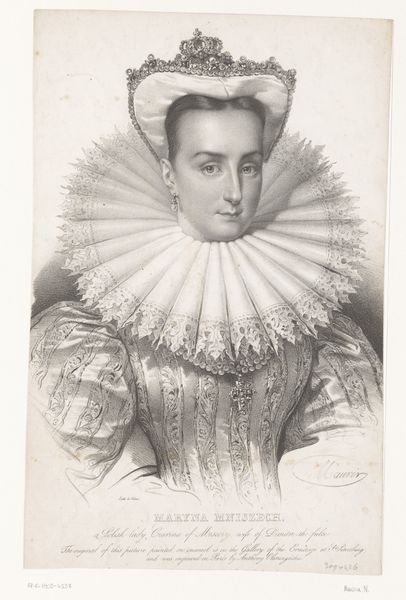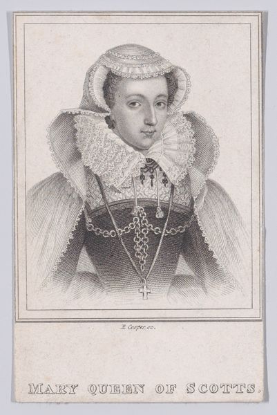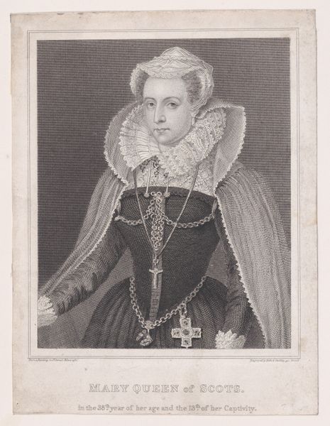 Editor: Here we have John Kay’s “Mary, Queen of Scots” from 1791, rendered as an engraving. The detail is incredible; her lace collar and the texture of her dress feel almost tactile. How does one begin to unpack such an image? Curator: Indeed. Note the almost mathematical precision in the hatching and cross-hatching that define the chiaroscuro. The ovoid frame, enclosing the figure, creates a visual compression, directing our gaze towards the central axis of her body. Do you observe any disruptions to this compositional stability? Editor: Now that you mention it, the lighting feels slightly uneven. Her face is illuminated, drawing the eye, but the deep shadows on her right side contrast sharply. Curator: Precisely. This unevenness in lighting introduces a certain dynamic tension. Furthermore, the details of the jewelry – the crucifix, the large cross pendant – hang heavy in the image, adding a pronounced vertical vector that both reinforces and challenges the contained space. The image seems to operate via the calculated juxtaposition of elements rather than symbolic messaging, don’t you think? Editor: That’s an interesting way to frame it. I was inclined to see them as symbols of her faith and position. Curator: And the choice of the engraver to utilize hatching at certain areas of her garments but none at others is important as well, for its varied uses draw different implications when viewed as one coherent representation of fabric, for example. Editor: I appreciate how this perspective focuses my attention on the artistic intent. I initially overlooked how meticulously the artist manipulated light and form. Curator: It allows us to consider the work outside historical interpretation.