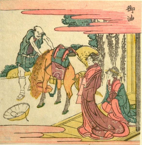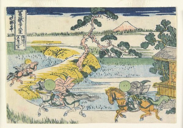 Editor: So, here we have Hokusai's "Three Travelers Waiting for Ferry by TenryÅ« River." It's part of a series, and I'm struck by how much character he manages to pack into such a small print. What stands out to you? Curator: It’s a fascinating glimpse into the commodification of travel, isn't it? The TÅkaidÅ road, and series like this, became popular as increased economic stability allowed commoners to travel. Hokusai is presenting this trip as accessible, and perhaps even mundane. Do you think this depiction democratizes travel? Editor: That’s a great point. It does feel more like a snapshot of everyday life than some grand adventure. I hadn't considered the social implications of that. Curator: Exactly! Hokusai offers a look at the popular consumption and cultural shaping of travel during that period. Editor: I’ll definitely look at it differently now. Thanks!