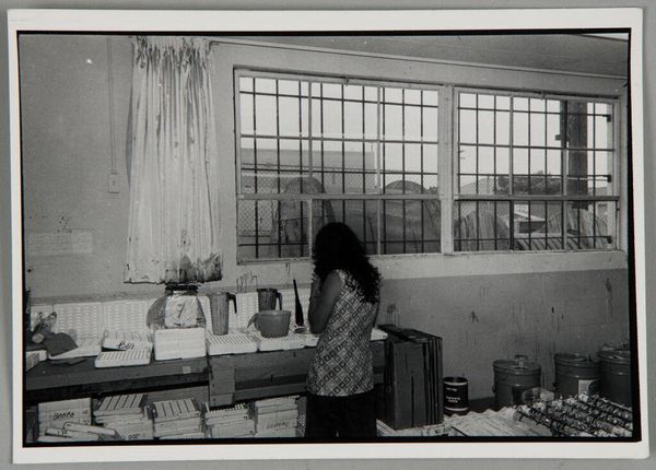 Curator: This gelatin silver print, titled "Dorie," was made in 1957. It presents a portrait embedded within a genre scene of domestic life. Editor: Immediately, I’m struck by the intimacy and the sense of quiet in this seemingly ordinary domestic scene. It feels both casual and deliberately composed. There's something evocative in its plainness. Curator: The appeal definitely resides in the quotidian. Consider the medium itself: the gelatin silver print, so common then, allowed for relatively inexpensive reproduction and distribution, bringing images of everyday life to a wider audience. Here, you see a very standard mid-century American kitchen, rendered through photography, documenting ordinary, available materials and production for daily activities. Editor: True, but for me it's more about the woman, Dorie, lost in her reading. The composition leads the eye to her, the soft light on her face highlighting a sense of interiority, in her reading—oblivious to the camera. I also love the mundane detail of the soda bottles beside the stove. They speak to another layer of her life. Curator: Those material details, though, are integral to the social context. These products of industry allowed Dorie to spend her free time engaging in cultural pursuits like reading; you have mass produced drink products along with textiles like table cloths giving texture to an image about the democratization of production, allowing her individual freedom to pursue interests within consumer capitalism. Editor: Absolutely, but there's a tender beauty in its imperfections too. It speaks volumes without needing grand gestures or explicit narratives, just a slice of mid-century existence. Curator: Perhaps what it captures most effectively is the symbiotic relationship between individuals and objects as the product of societal structure and forces of material. Editor: And the quiet dignity within those everyday moments that often go unnoticed, wouldn't you say? Curator: Undeniably. "Dorie" reminds us that significance can often be found in the most unassuming of places. Editor: It lingers with you. I wonder what she was reading. I am reminded of that passage in Proust, in the madeleine experience... Well, I see so much possibility just beyond the edges of this little image.
