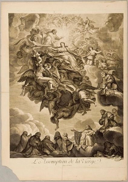 Curator: This is Pierre Drevet's "Resurrection," housed here at the Harvard Art Museums. It presents a compelling interplay of light and shadow. Editor: It's quite dramatic, a powerful scene of divine intervention. The figures seem overwhelmed by the radiant presence. Curator: Indeed. Note the swirling clouds, the radiating light emanating from Christ, and the startled reactions of the soldiers below. The composition emphasizes a clear hierarchy, placing the resurrected Christ at the apex. Editor: And those soldiers, tumbling amidst the chaos. It speaks to power structures being toppled, of an order overturned by a revolutionary figure. The narrative resonates with liberation. Curator: The artist masterfully utilizes the technique of chiaroscuro to create depth and evoke a sense of awe. The textures are meticulously rendered. Editor: Absolutely, and the image, even without knowing the exact date, feels inherently political. It challenges earthly authority. Curator: It's certainly a visually striking example. Editor: Yes, a moment of upheaval, skillfully captured, a reminder that hope often emerges from chaos.