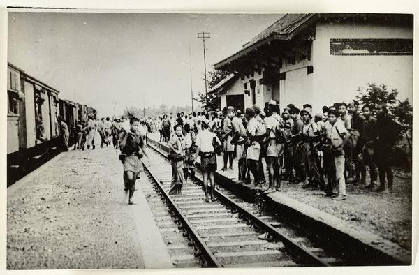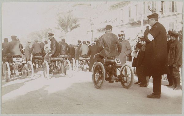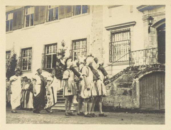 Editor: This is a photograph from 1916, "Members of an international mission at the front in the Dolomites," a gelatin-silver print by Henri de Rothschild. It depicts a group of uniformed men in front of a building. I'm struck by the uniformity of their dress despite the supposed internationality and the…muddy quality of the ground they're standing on. What catches your eye in this image? Curator: I see a fascinating document of production. Consider the gelatin-silver print – a relatively modern process at the time. It allowed for mass production and dissemination of images. Rothschild, embedding himself in this mission, documents not just the officers but the logistical network of image-making. The mud you note is integral – it's the very substance these men are fighting over, the material foundation of the conflict and subsequently, this image's production as propaganda. The uniformity isn’t a negation of their different nationalities, but rather an acknowledgement of them working together to reach similar means. Editor: So you’re saying the process of making the image is almost as important as what the image shows? Curator: Exactly. What kind of labour was necessary to record such events, reproduce these photographs and, considering Rothschild’s wealth, to disseminate these images so widely during a war largely fueled by industrial production? Editor: That's an interesting point. It highlights the connection between art, manufacturing and its use for cultural documentation as well as war. I’d never thought of photography in quite that light. Curator: Consider the global network required for materials, distribution, and consumption of such images; photography is itself a material component to modern conflict. Editor: Looking at it that way gives a whole new appreciation for the role that even something like a photograph can play in such a large conflict. Curator: Precisely. By understanding the mechanics of its making, we can appreciate this piece less as simply an historical record, but as an intricate cog in the war effort itself.