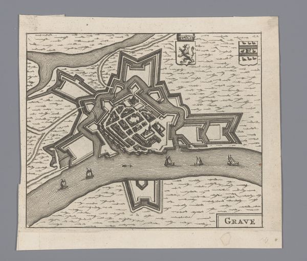 This is an anonymous print from 1702, depicting the siege of Venlo. It was made using etching, a process that involves using acid to cut into a metal plate, which is then inked and printed onto paper. The fine lines and precise details we see here are a direct result of this meticulous technique. Etching allowed for the relatively easy reproduction of images. In the 18th century, it became a widespread method for disseminating information. Consider the labor involved: the skilled artisan carefully drawing the design, the etcher manipulating the acids, the printer operating the press. This wasn't just about art, but also about communication, propaganda, and power. Maps like these were crucial for military strategy, asserting territorial claims, and shaping public perception of conflicts. The print embodies the intersection of craft, technology, and the socio-political landscape of its time. This piece reminds us that even seemingly simple objects can reveal complex stories about labor, politics, and consumption.