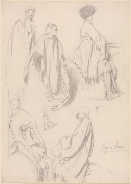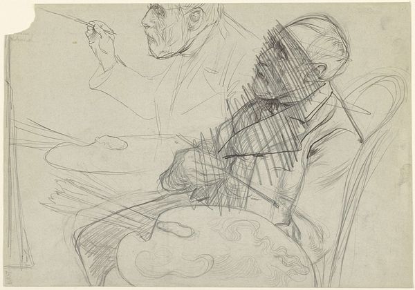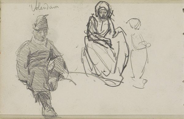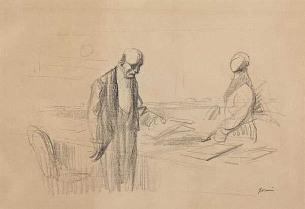 Curator: This is Jean-Louis Forain’s drawing, "The Departure for Versailles," created around 1919. What strikes you first about it? Editor: There’s a somber mood hanging over the figures, a sense of weariness etched onto the seated woman's face. It almost feels ghostly because of the wispy lines, particularly surrounding the standing figures behind her. Curator: Forain was a master of capturing social realities, often focusing on the marginalized. Consider the implications of displacement implied by the title itself. "The Departure for Versailles" could signify the exodus of ordinary people seeking refuge or a new life amidst postwar upheaval, a direct result from the Treaty signed at Versailles in 1919. It hints at how political decisions at a global level inevitably impact on personal lives. Editor: The fact that it’s a drawing makes me consider the ready availability and humble character of pencil and paper and the work's proximity to major historical events, right after World War I, for example. The artist has carefully applied the material, especially in the contrasts of dark and light, yet the composition still seems incomplete or intentionally ephemeral. How much did the economic status of both artist and sitter affect artistic choice? Is it an observational sketch or a conceptual exploration? Curator: I’d argue the open quality of the medium, pencil on paper, reflects the unsettled, unresolved conditions in Europe in the late teens and early twenties. The Treaty promised peace but it reshaped social order and destabilized communities as a result. The rough line work contributes to its poignancy, doesn’t it? Editor: Indeed. Thinking of materiality, the texture of the paper and the deliberate weight of the pencil strokes around the figure of the seated woman point to artistic decisions related to how that figure may function within the work as a whole. How do the artistic techniques mirror or mediate this period of social rebuilding after so much violent destruction and forced relocation? Curator: The rapid pace with which a pencil sketch can be executed also suggests the artist responding in real time. In this drawing, Forain highlights the cost exacted on the human psyche by large-scale political maneuvering. Editor: The deliberate choice to highlight the seated woman underscores an intimacy not unlike one might see reflected in someone's personal sketchbook from that moment, as though glimpsed at the instant of its generation. A very telling view of this artist at this fraught turning point. Curator: A haunting glimpse, to be sure, that encapsulates both an immediate experience and broader historical currents.